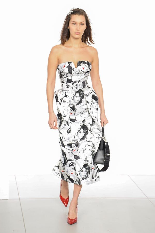 Work that walk, Bella Hadid!! This must be one of my favorite dresses from this collection and that’s all because of the faces on it. I mean, come on, let’s walk away from patterns we are so used to seeing ( florals, military, plaid ) and let’s try something new. Put a face on a dress. Add emotion. Add flare. Add passion.
