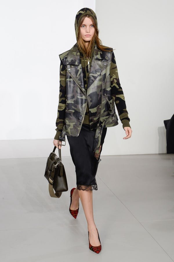I am not sure who would be able to pull off that outfit, but I do know that I would like to give it a try. I love this military pattern, it has something dark and mysterious that attracts my eye and the way it fits to the body is rather interesting. I find it amazing how well and stylish it looks and it appears to be a sleeveless jacket matched with the same pattern of a hoodied sweatshirt. Classy goes sassy and vice versa. The black fabric skirt is a bonus to this whole outfit, it’s possibly Kors’s way to prove that you can dress like a model even while wearing a hoodie.