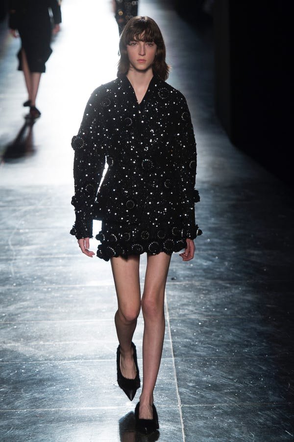 This is not a dress. Obviously, this look ( this suit type of outfit ) requires fashion sense and bravery. You need to be completely cool, a proper fashion icon, to be able to pull off its shiny details and the fur balls on it. Personally, I believe it’s very chic, it has this dark shade that I love – even if it’s spring – and the shiny details, like diamonds, are an imaginative plus. A shiny silver flare for a dark look