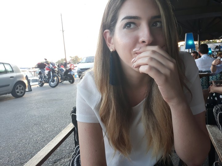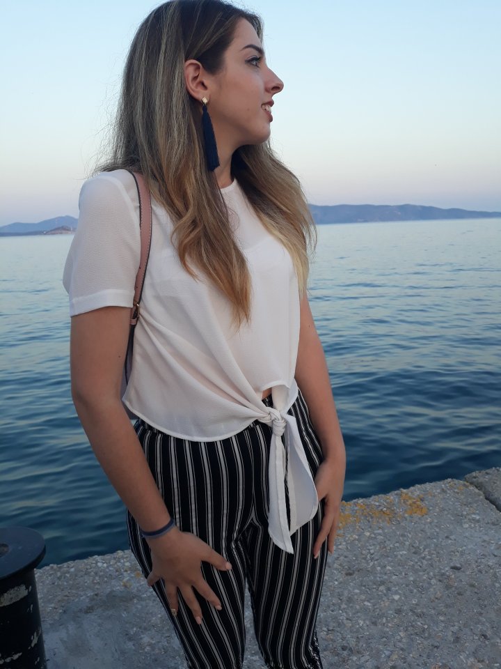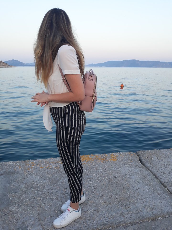 Personally, for a walk by the sea ( and for a glass of cold coffee afterwards) I wanted to be very summer-ly but without having to wear a dress to look the part. That’s why I figured my brand new white top from Forever 21 would look very good with my deep blue (almost black) and white stripes pair of pants from H&M, my white Adidas (my ultimately favorite sneakers) and my little pink-ish backpack from Accessorize .