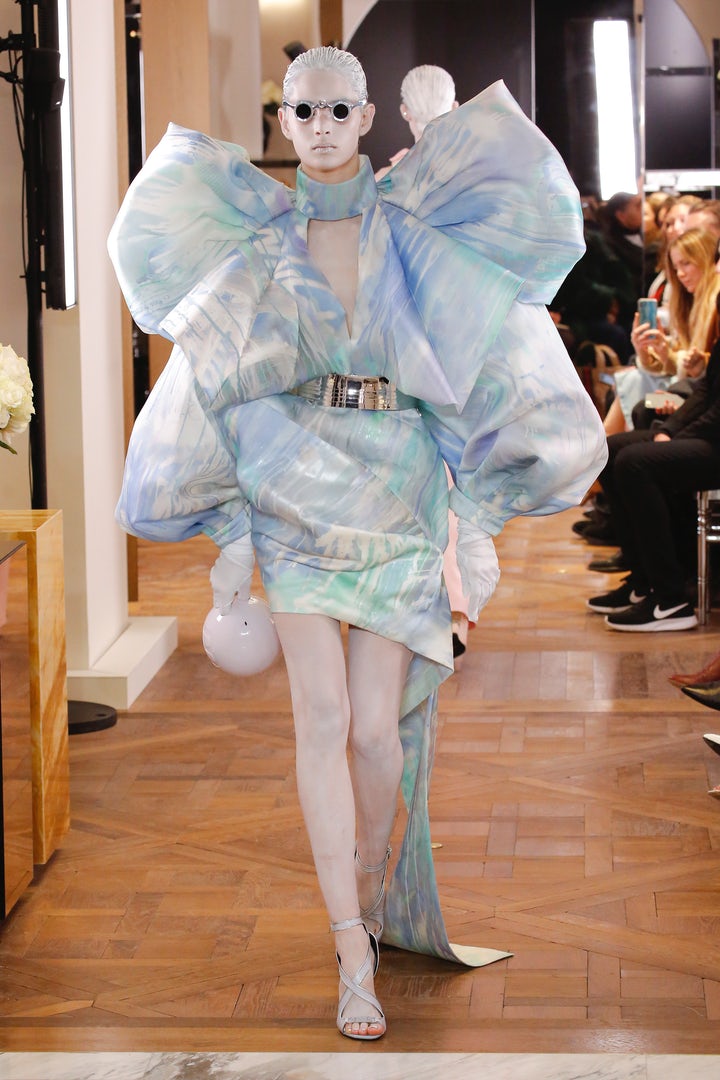 White pastel colors married satin fabric in Rousteing’s Couture collection. We saw a lot of volume on the shoulder and fancy belts almost on all outfits, along with statement sunglasses and a bag with a large B sprayed on it. I really liked the way Rousteing experimented with pastel colors and layers on the upper body and still managed to keep it classy and Balmain-appropriate. It’s something that’s hard to do, but when done correctly is truly beautiful.