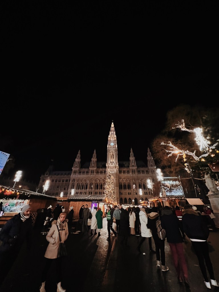 I saw amazing sceneries along the Christmas Markets that are mentioned feverishly during this time, but also palaces and art galleries. I walked the busy lit streets of Vienna with their baroque aesthetic mixed with the holiday spirit and tasted their famous hot chocolate in those red mugs you can take home if you like to. I tasted their specialty, which is schnitzel, and roamed around the center of the city in order to find the most delicious Mozart chocolates. Are you ready to take a mini mental journey through them with me?