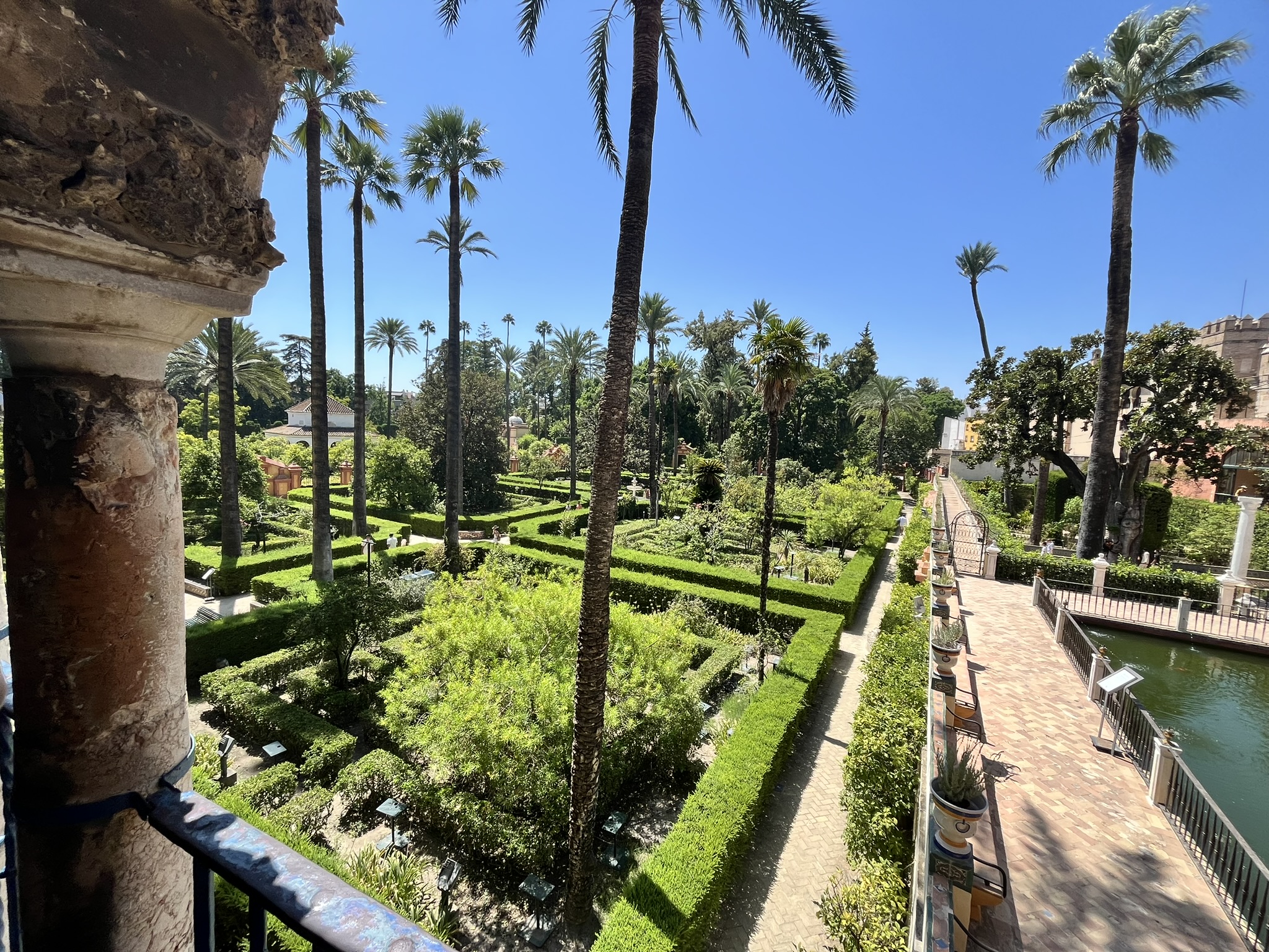 Jumping over to Seville, the Palace there is like a little labyrinth. The entrance is next to the cathedral, you will see he lion over the gate. You pay a decent amount for a ticket of course, also available on their website and of course, you get checked out at the entrance. The inside is spacious, with gardens, peacocks and ducks lounging around, a small fountain and a very interesting architecture. Stand on the second floor, on the sidelines, and watch the gardens. Almost, feels like you are part of the fairytale.